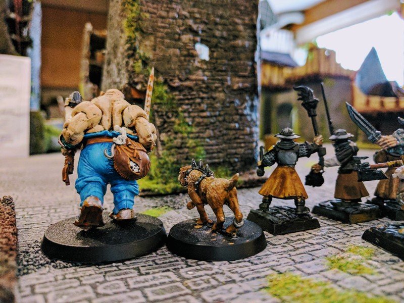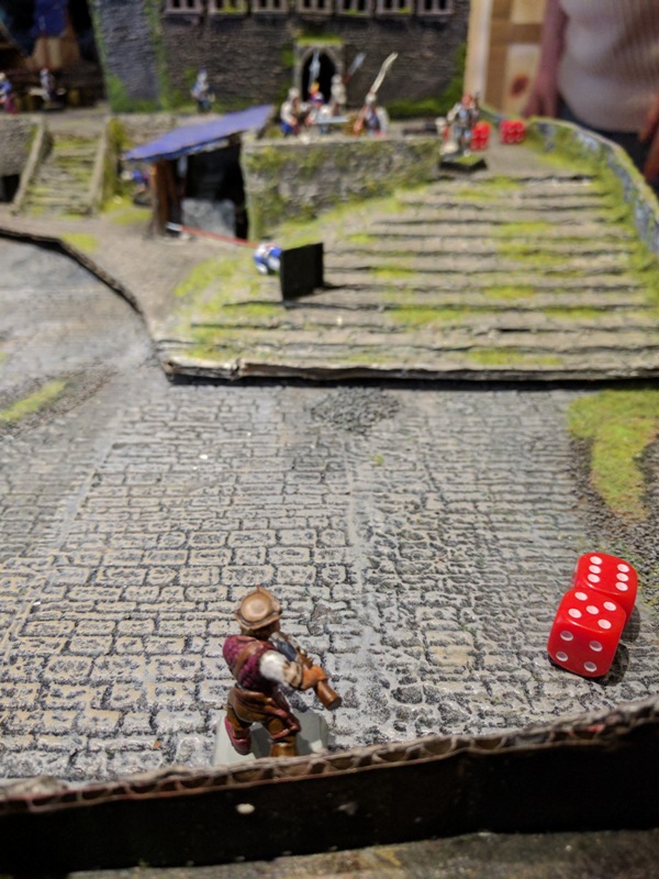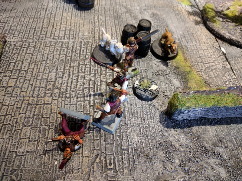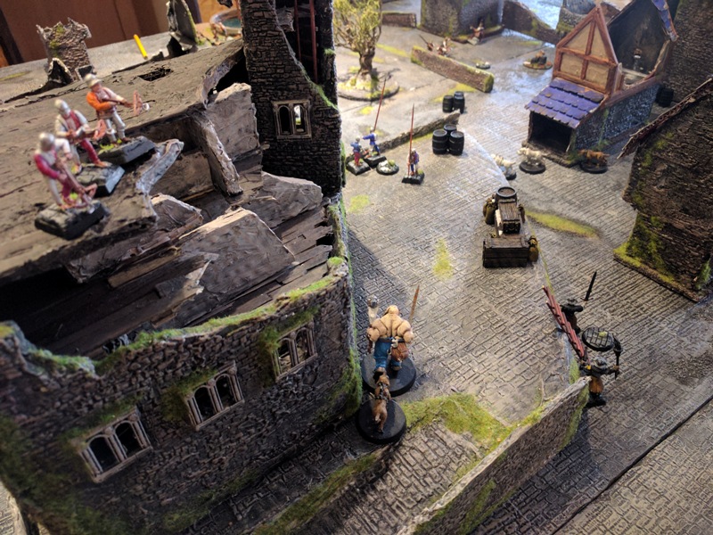 El inexorable avance de los cazadores hizo que los tileanos vieran convertida su privilegiada posición en una trampa mortal. El ogro trepó por la mansión defenestrando a un ballestero. Sí, tras una lluvia de golpes, sólo logró "derribar" al tielano, pero con tan mala suerte que cayó desde lo alto al más puro estilo del Medievo X-D.