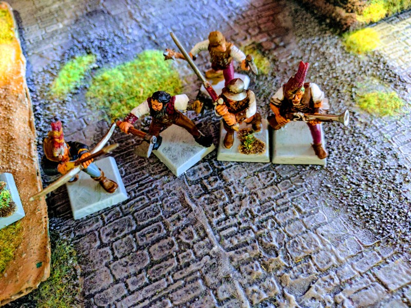 Respecto a la banda Tileana... Se cogió una banda de por ahí, no sé. Soy muy purista del reglamento y me cabrea sobremanera jugar con banda "de por ahí", pero qué se le va a hacer. Al final hay que tragar sí o sí. Mi grupo es muy buena gente y no coge cosas muy op. Básicamente son Reiklandeses con alguna opción especial de espadas de alquiler y más disponibilidad de ballestas. Las miniaturas son de milicia de GW y si no recuerdo mal, de Perry Miniatures. Yo no estoy nada puesto, me quedé en el GW de los 2000, pero en mi grupo me hablan mucho y muy bien de Perry (ex GW de cuando yo tenía pelo).
