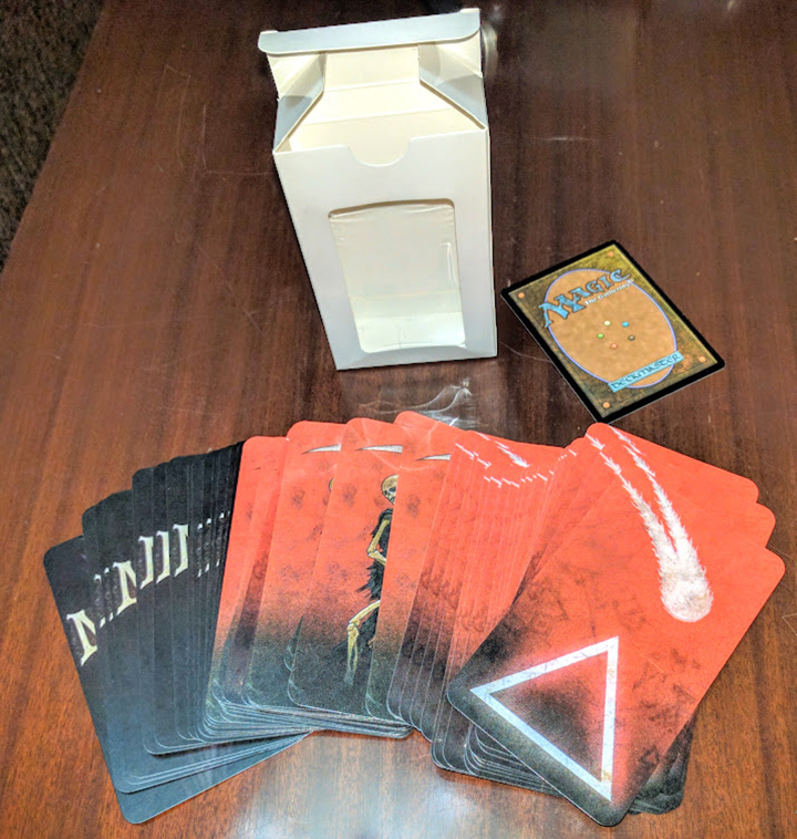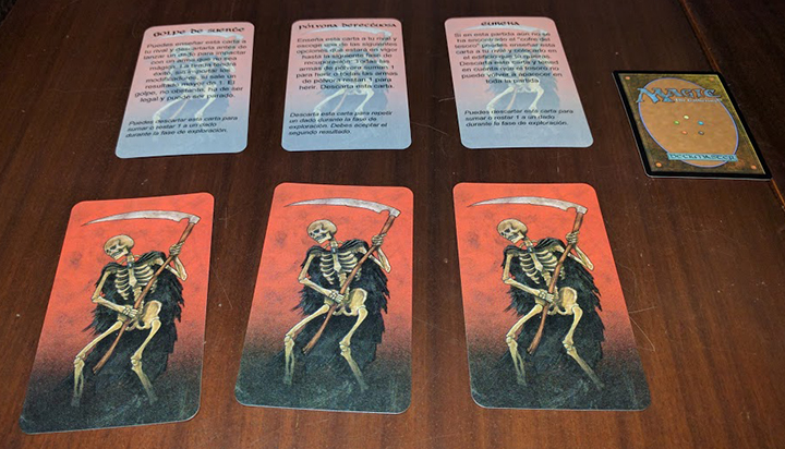 He editado las cartas. Como curiosidad, si los cálculos no me fallan, si cada jugador roba una carta de "Destino" de un mazo distinto y luego una de "Fatalidad" del mismo mazo, salen 39.900 partidas distintas.